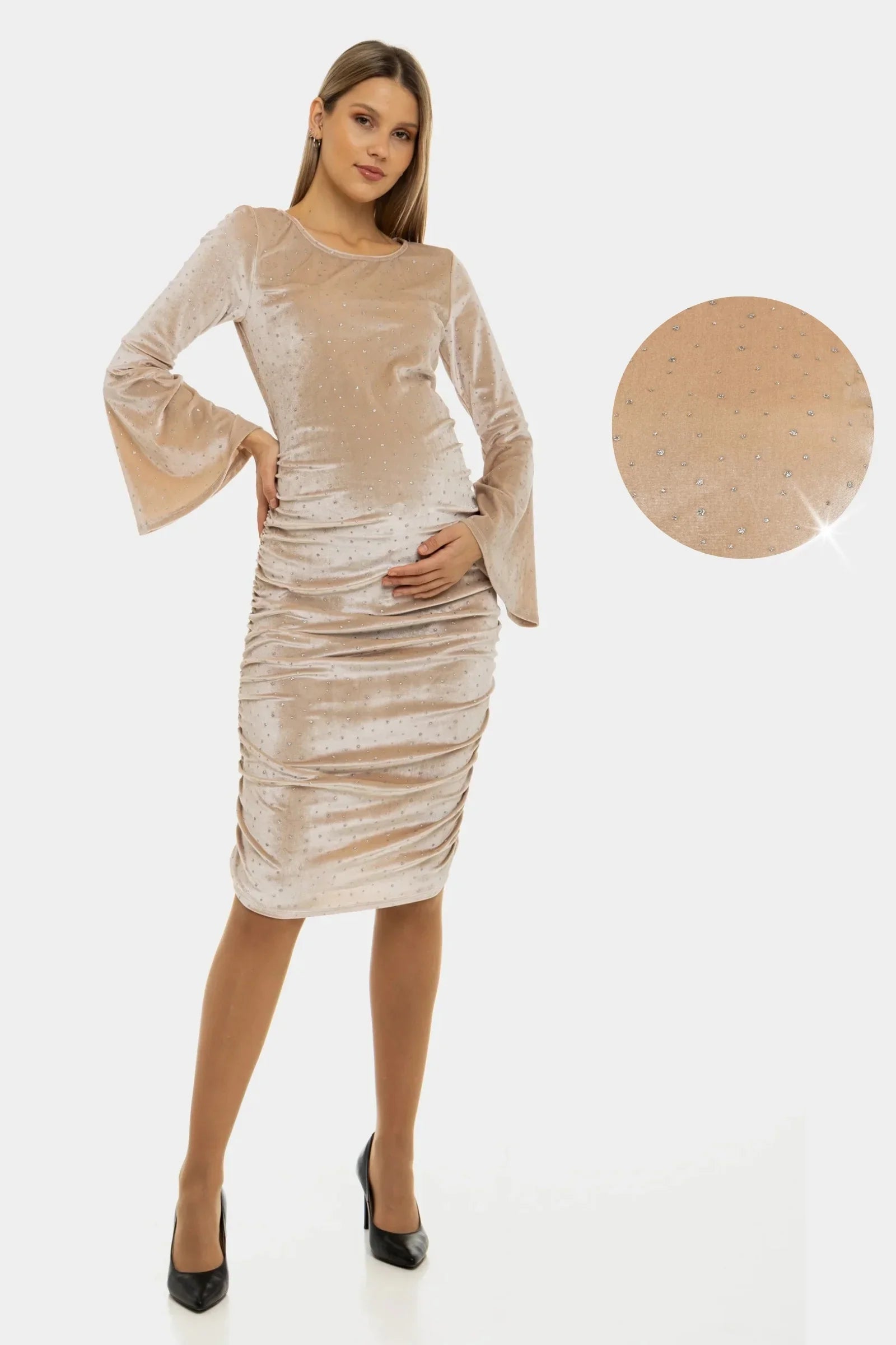 - Φόρεμα εγκυμοσύνης από ελαστικό βελούδο με γκλίτερ σε μπεζ χρώμα