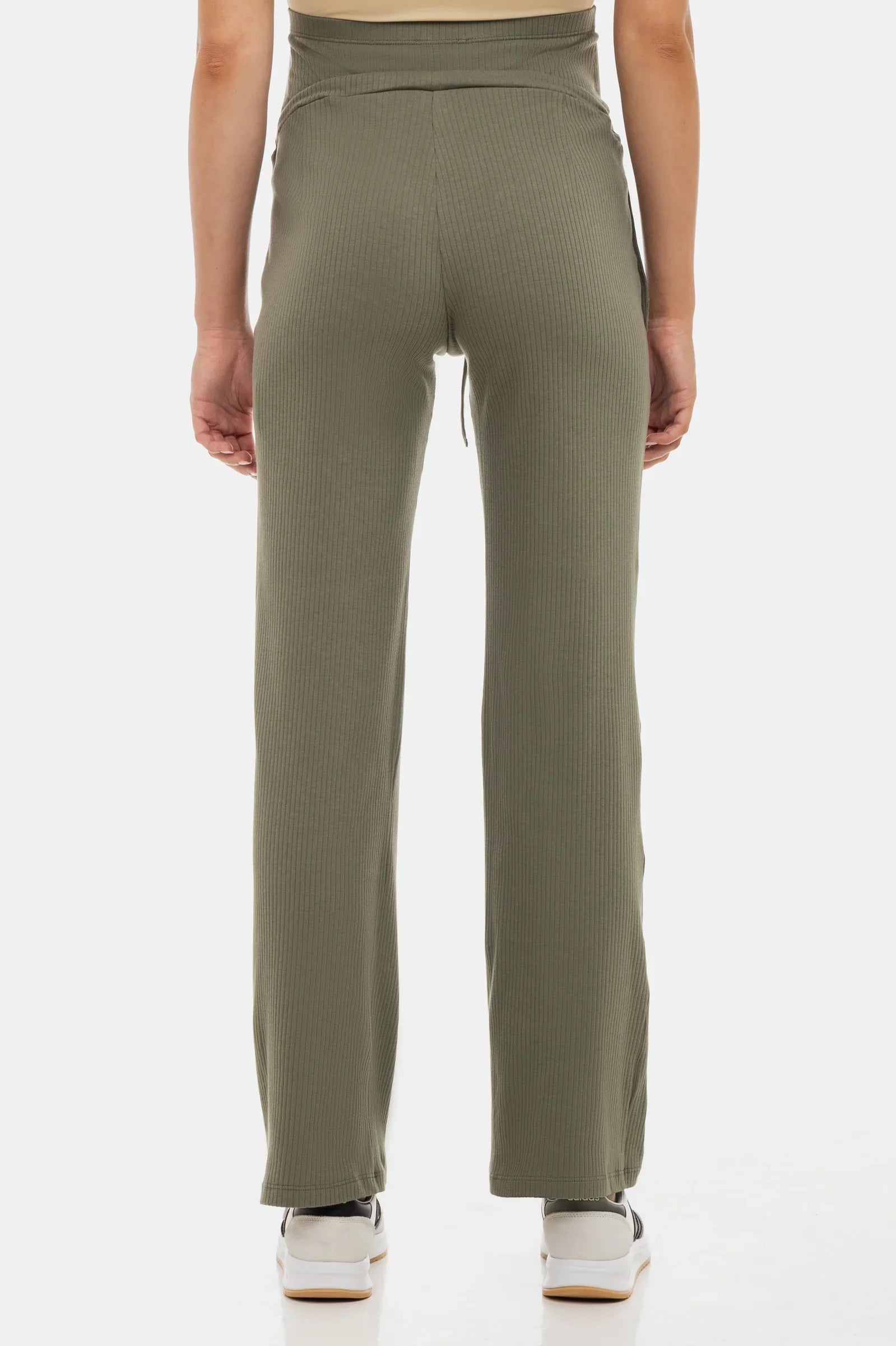 Μαλακό ριπ παντελόνι εγκυμοσύνης με ελαφρώς καμπάνα μπατζάκια και δέσιμο με κορδόνι – μέγιστη άνεση σε κομψό χακί χρώμα.