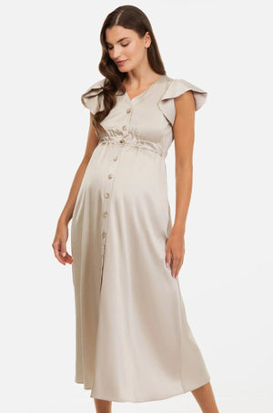 Μπεζ σατινέ φόρεμα εγκυμοσύνη και θηλασμού με βολάν