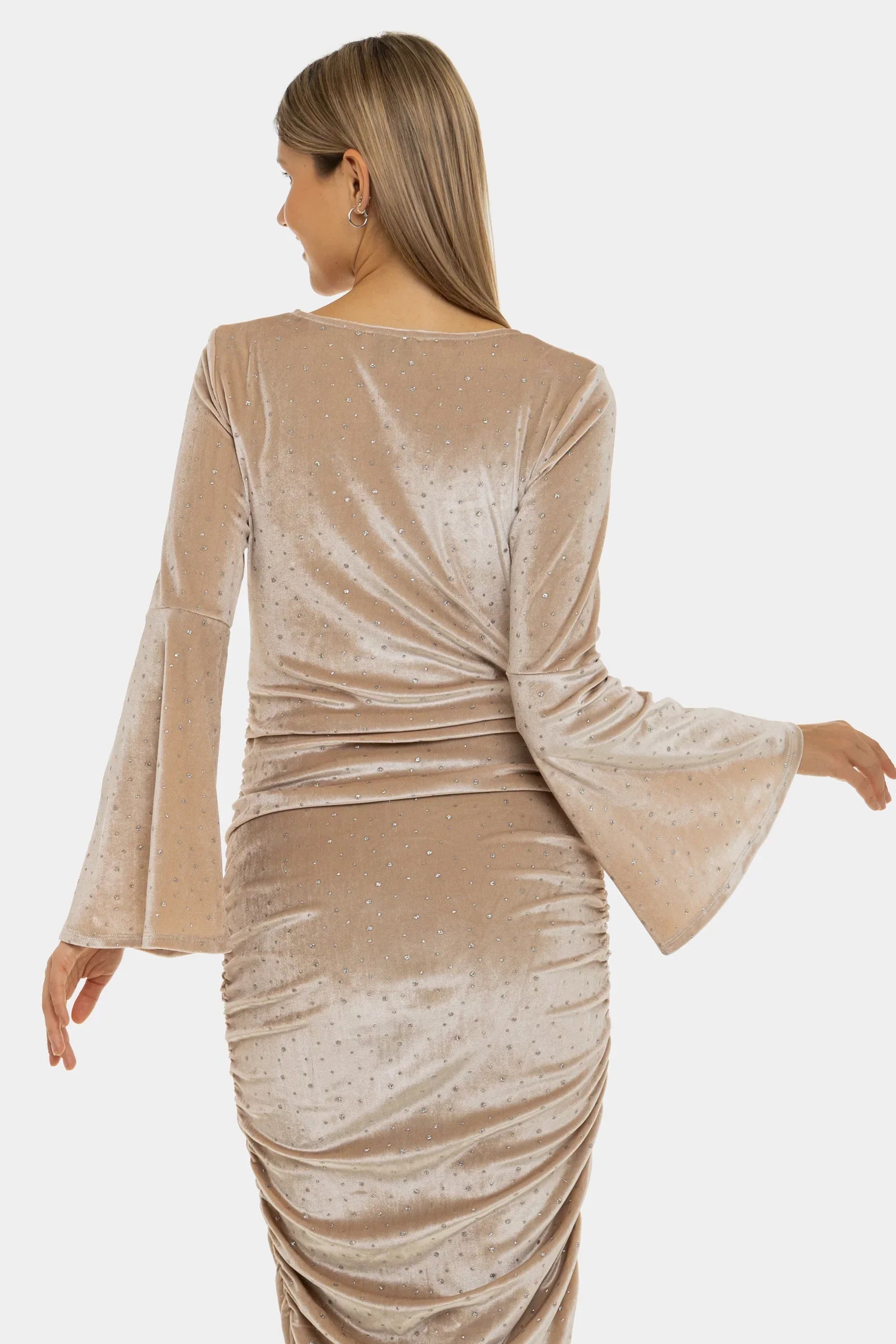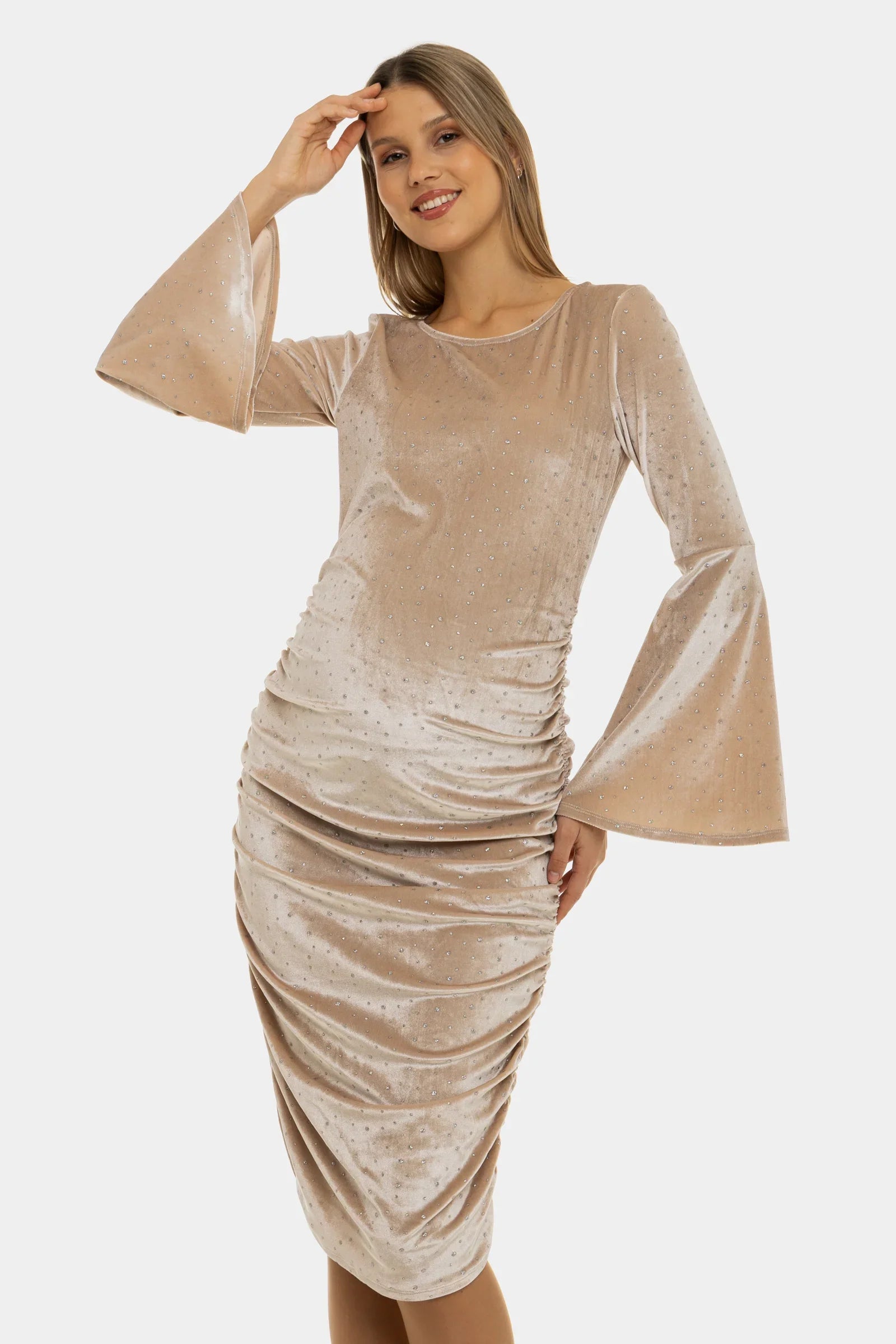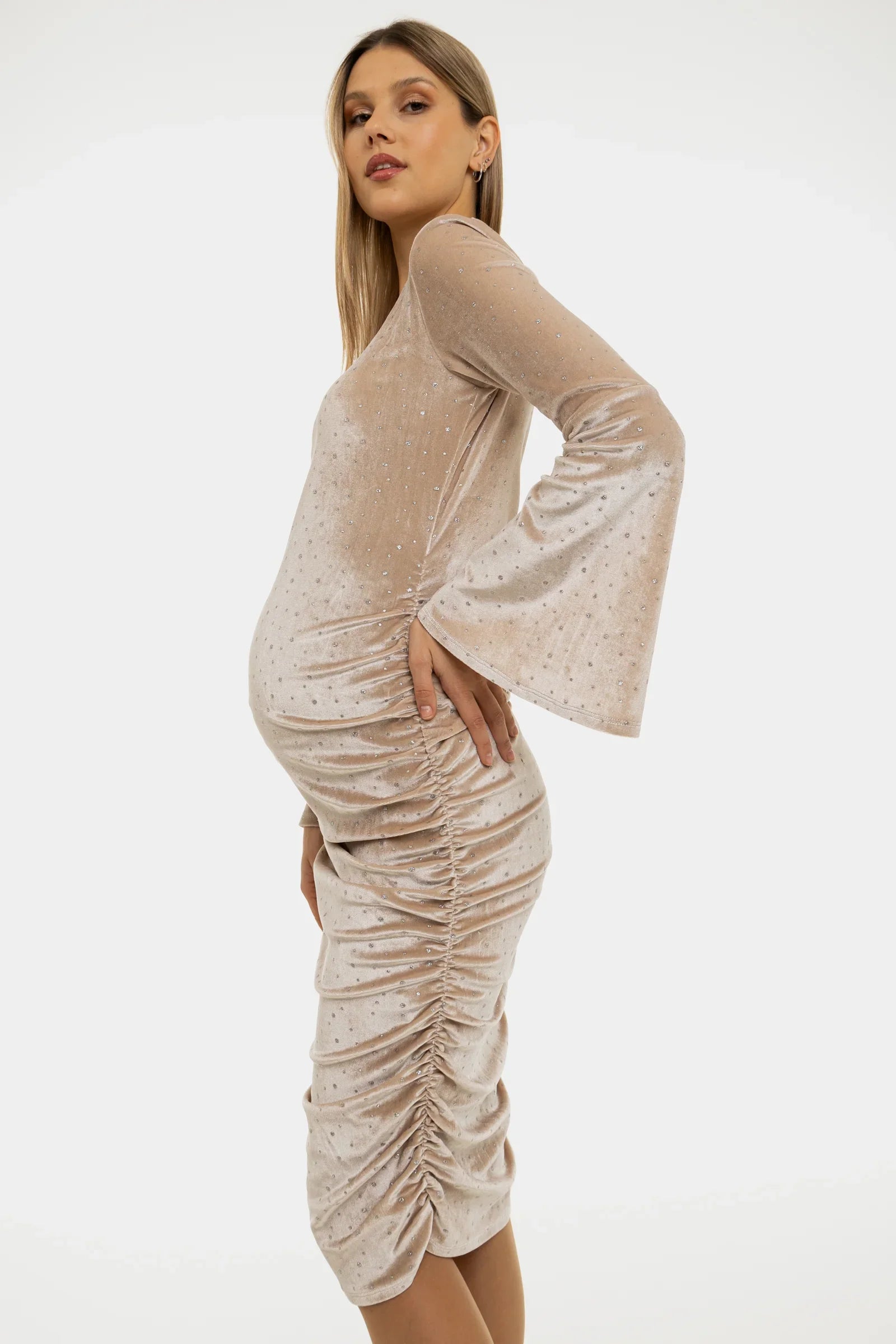 - Φόρεμα εγκυμοσύνης από ελαστικό βελούδο με γκλίτερ σε μπεζ χρώμα