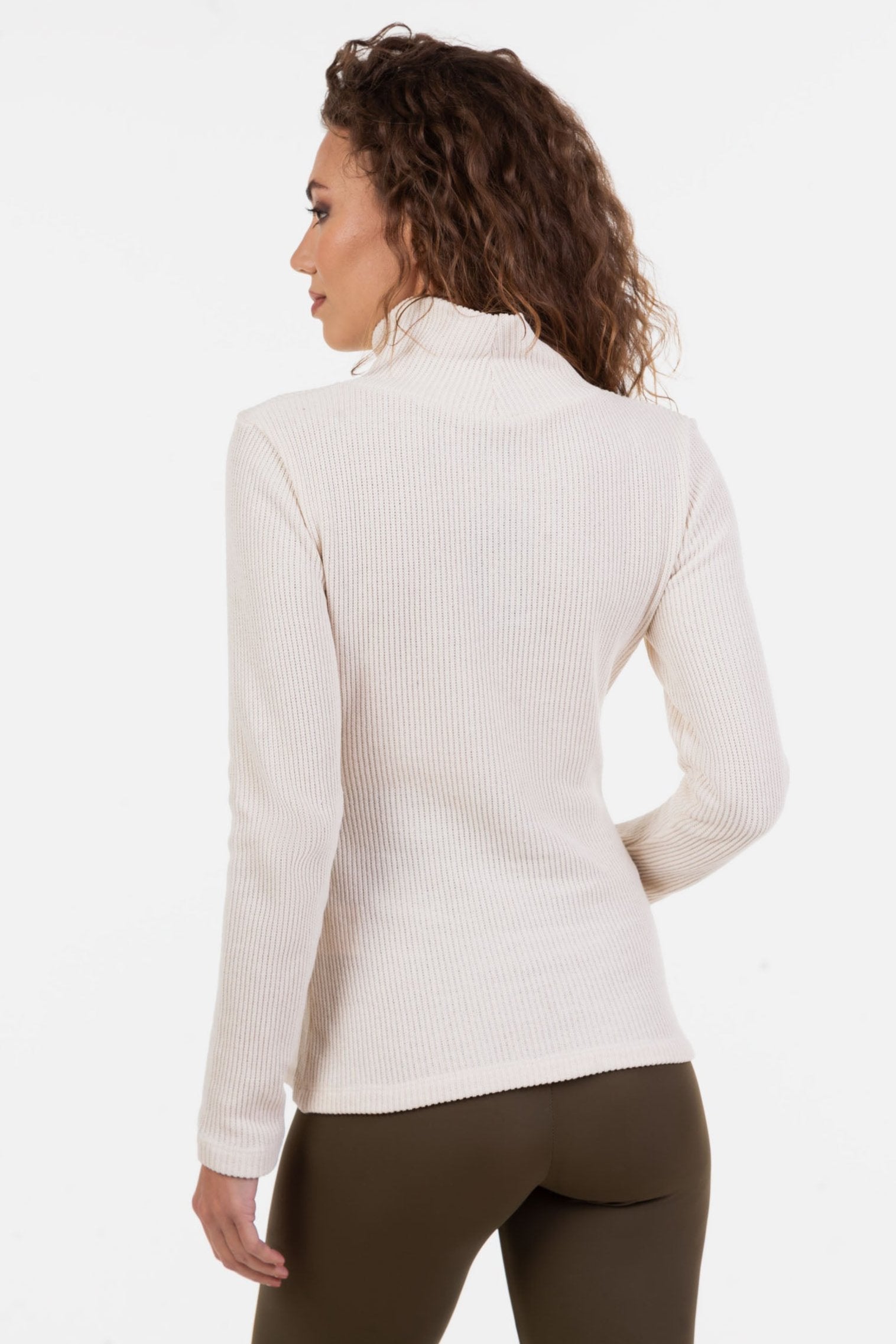 - Το πουλόβερ είναι πλεκτό με ανακυκλωμένο βαμβάκι σε εκρού χρώμα