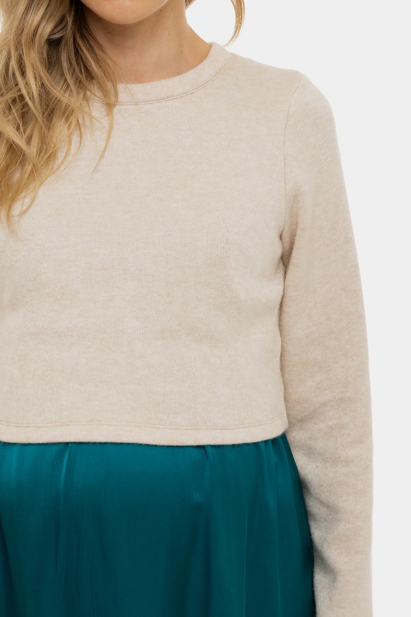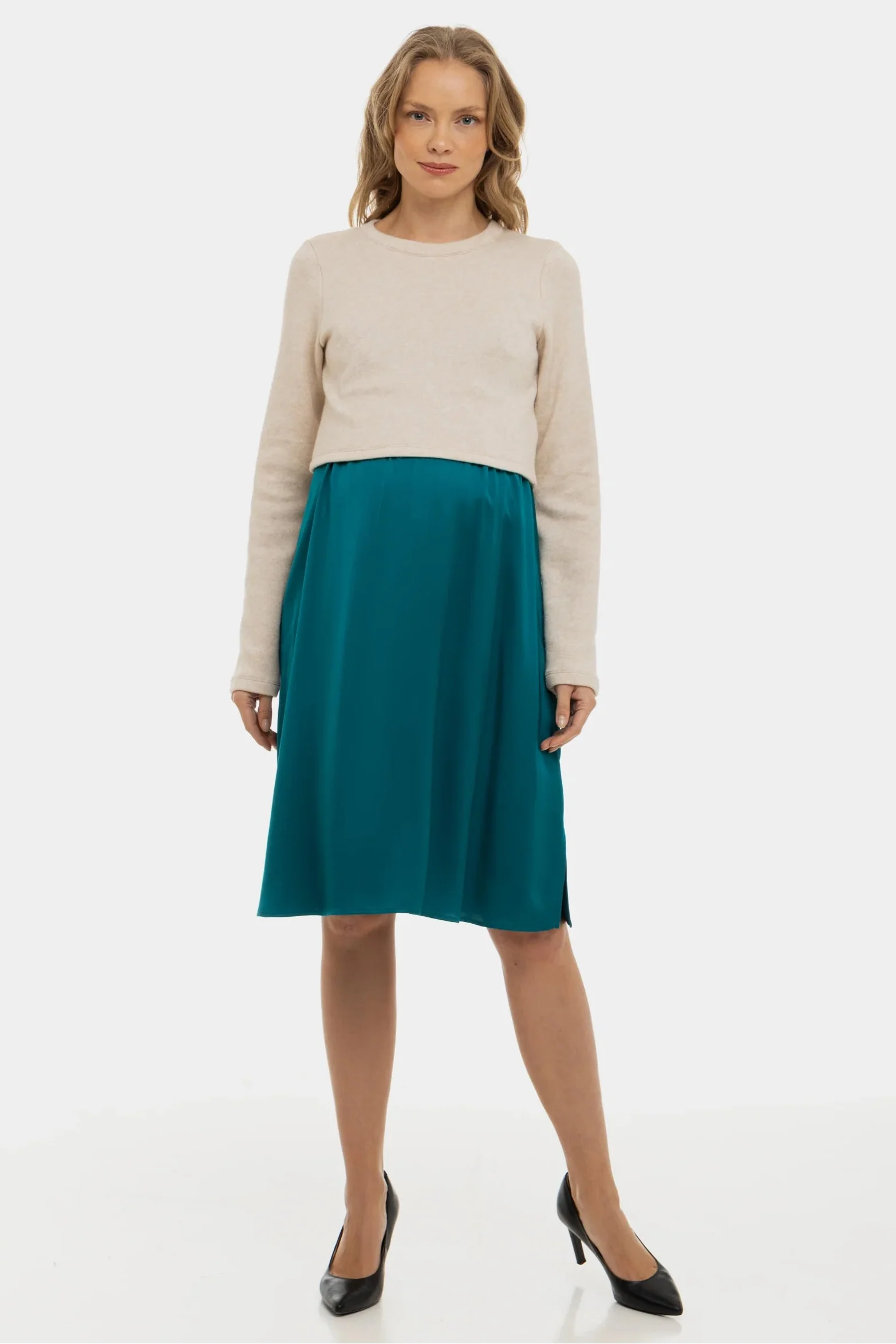 Αυτό το φόρεμα είναι ένας συνδυασμός ενός άνετου πουλόβερ και μιας κομψής σατέν φούστας, ειδικά σχεδιασμένο για να σου προσφέρει στυλ και άνεση κατά τη διάρκεια της εγκυμοσύνης και μετά από αυτήν!