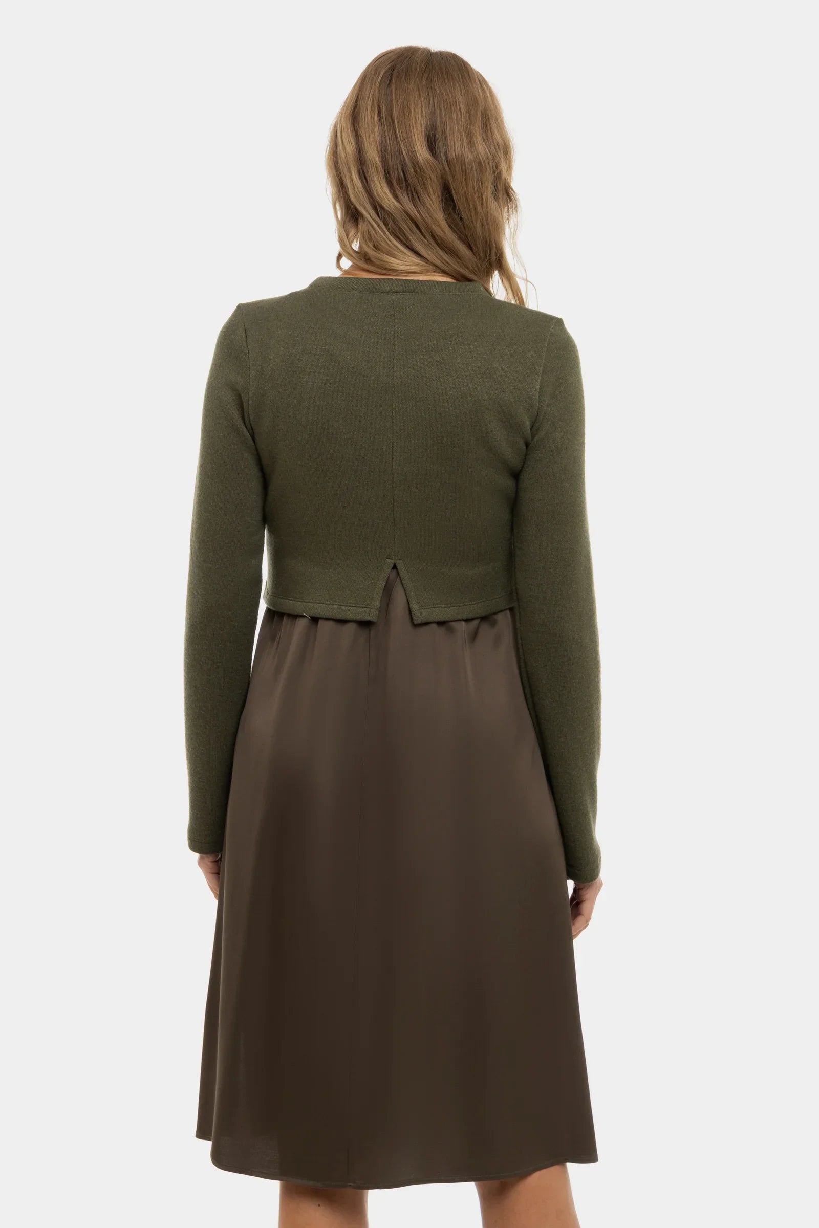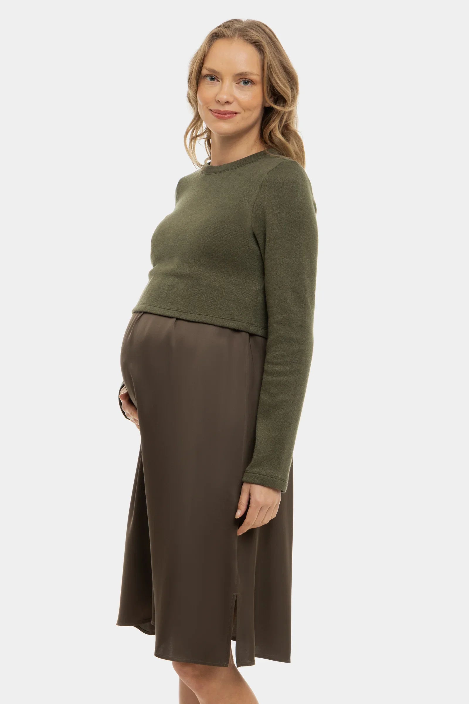 Αυτό το φόρεμα είναι ένας συνδυασμός ενός άνετου πουλόβερ και μιας κομψής σατέν φούστας, ειδικά σχεδιασμένο για να σου προσφέρει στυλ και άνεση κατά τη διάρκεια της εγκυμοσύνης και μετά από αυτήν!