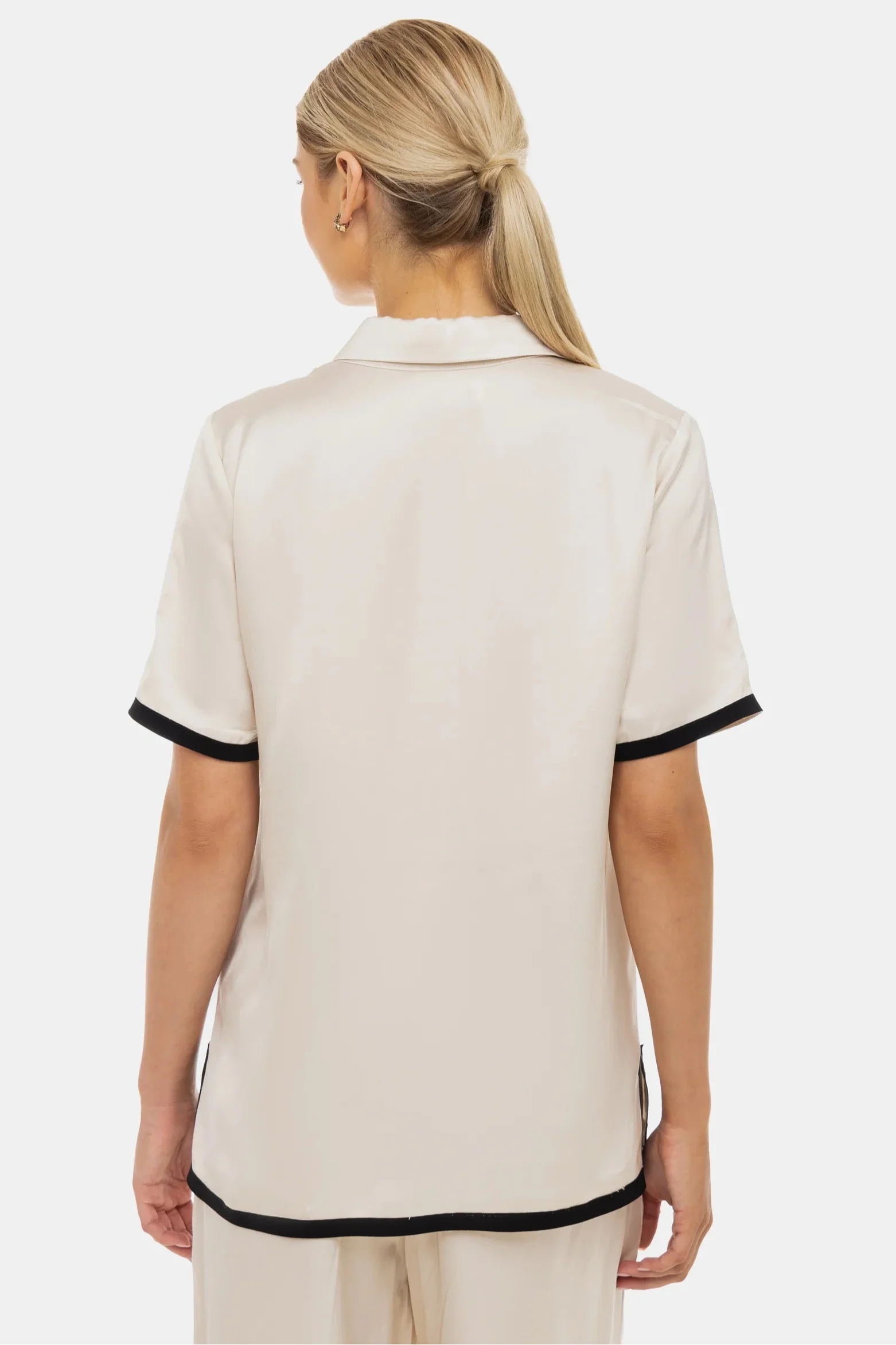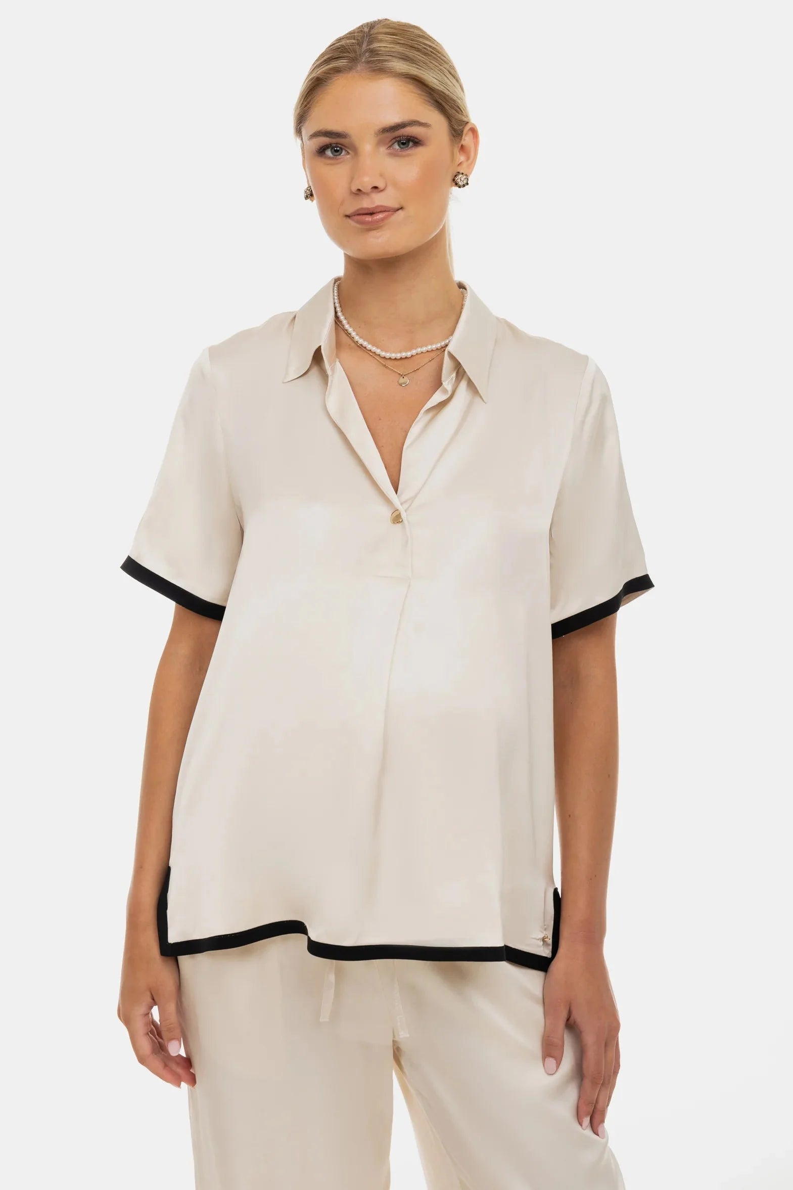 - Μπλούζα εγκυμοσύνης από γυαλιστερό σατέν σε εκρού απόχρωση